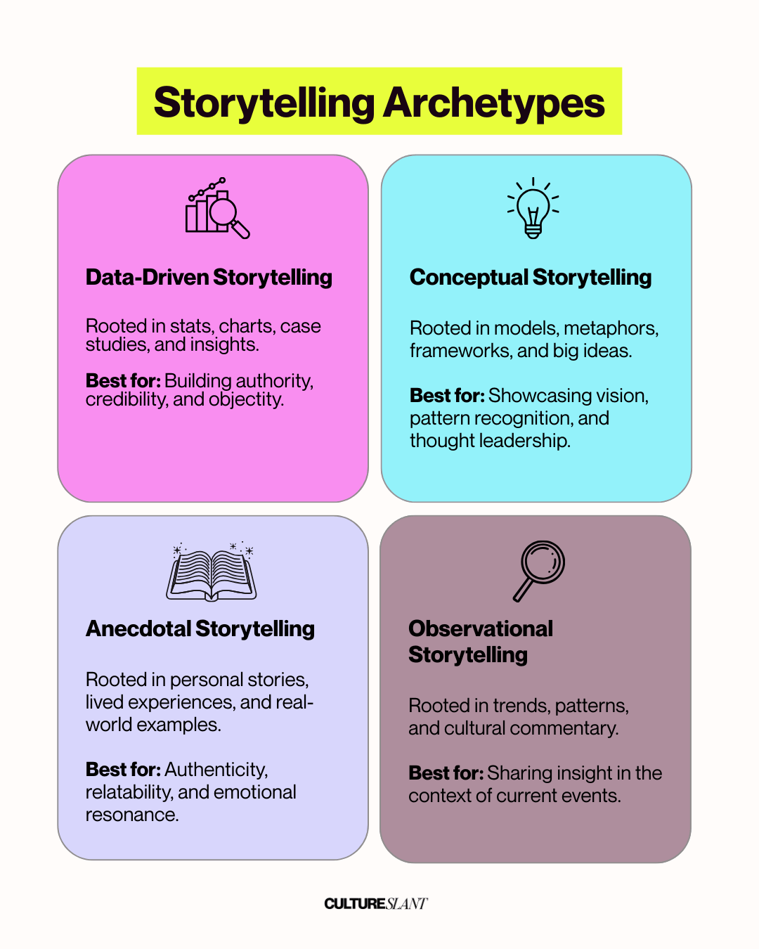 I call this Storytelling Archetypes. I’ve defined four that broadly express how we tell stories: Data-driven, Conceptual, Anecdotal, and Observational.